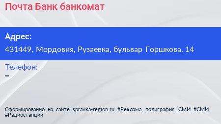 Почта Банк, банкомат по адресу 431449, Мордовия, Рузаевка, бульвар Горшкова, 14 в дальнейшем Организация, размещена в следующих категориях: