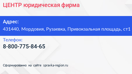 ЦЕНТР, юридическая фирма по адресу 431440, Мордовия, Рузаевка, Привокзальная площадь, ст1 в дальнейшем Организация, размещена в следующих категориях:
