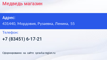 Медведь, магазин по адресу 431440, Мордовия, Рузаевка, Ленина, 55 в дальнейшем Организация, размещена в следующих категориях:
