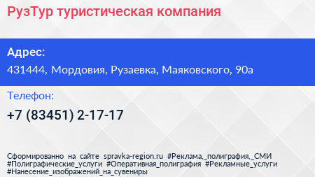 РузТур, туристическая компания по адресу 431444, Мордовия, Рузаевка, Маяковского, 90а в дальнейшем Организация, размещена в следующих категориях: