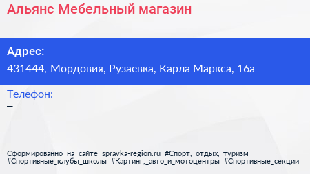 Альянс, Мебельный магазин по адресу 431444, Мордовия, Рузаевка, Карла Маркса, 16а в дальнейшем Организация, размещена в следующих категориях: