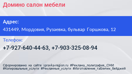 Домино, салон мебели по адресу 431449, Мордовия, Рузаевка, бульвар Горшкова, 12 в дальнейшем Организация, размещена в следующих категориях: