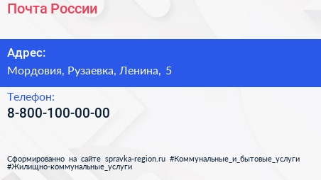 Почта России по адресу Мордовия, Рузаевка, Ленина, 5 в дальнейшем Организация, размещена в следующих категориях: