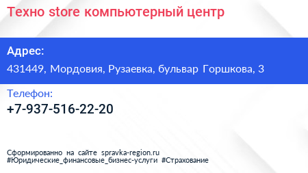 Техно.store, компьютерный центр по адресу 431449, Мордовия, Рузаевка, бульвар Горшкова, 3 в дальнейшем Организация, размещена в следующих категориях: