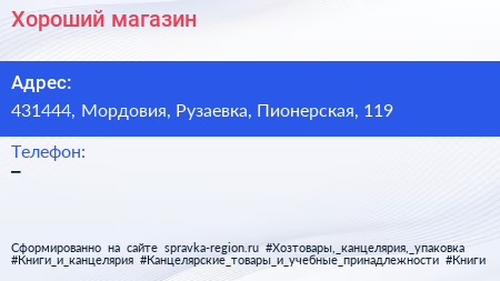 Хороший, магазин по адресу 431444, Мордовия, Рузаевка, Пионерская, 119 в дальнейшем Организация, размещена в следующих категориях: