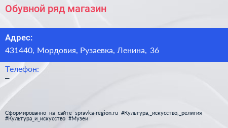 Обувной ряд, магазин по адресу 431440, Мордовия, Рузаевка, Ленина, 36 в дальнейшем Организация, размещена в следующих категориях: