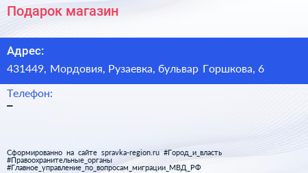 Подарок, магазин по адресу 431449, Мордовия, Рузаевка, бульвар Горшкова, 6 в дальнейшем Организация, размещена в следующих категориях:
