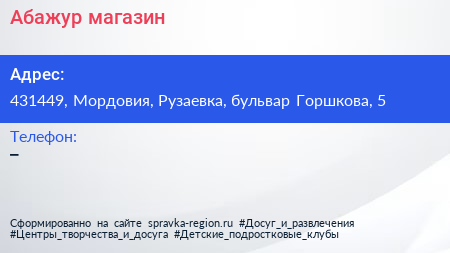 Абажур, магазин по адресу 431449, Мордовия, Рузаевка, бульвар Горшкова, 5 в дальнейшем Организация, размещена в следующих категориях: