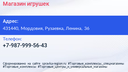 Магазин игрушек по адресу 431440, Мордовия, Рузаевка, Ленина, 36 в дальнейшем Организация, размещена в следующих категориях: