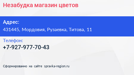 Незабудка, магазин цветов по адресу 431445, Мордовия, Рузаевка, Титова, 11 в дальнейшем Организация, размещена в следующих категориях: