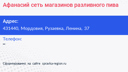 Афанасий, сеть магазинов разливного пива по адресу 431440, Мордовия, Рузаевка, Ленина, 37 в дальнейшем Организация, размещена в следующих категориях: