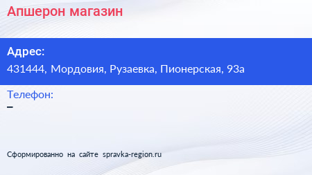 Апшерон, магазин по адресу 431444, Мордовия, Рузаевка, Пионерская, 93а в дальнейшем Организация, размещена в следующих категориях: