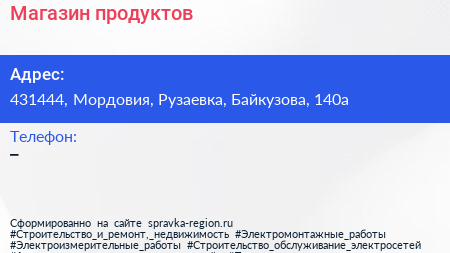 Магазин продуктов по адресу 431444, Мордовия, Рузаевка, Байкузова, 140а в дальнейшем Организация, размещена в следующих категориях: