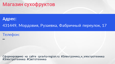 Магазин сухофруктов по адресу 431449, Мордовия, Рузаевка, Фабричный переулок, 17 в дальнейшем Организация, размещена в следующих категориях: