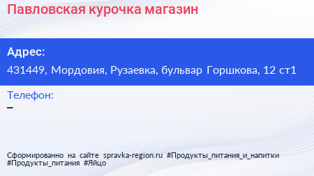 Павловская курочка, магазин по адресу 431449, Мордовия, Рузаевка, бульвар Горшкова, 12 ст1 в дальнейшем Организация, размещена в следующих категориях: