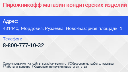 Пирожникофф, магазин кондитерских изделий по адресу 431440, Мордовия, Рузаевка, Ново-Базарная площадь, 1 в дальнейшем Организация, размещена в следующих категориях: