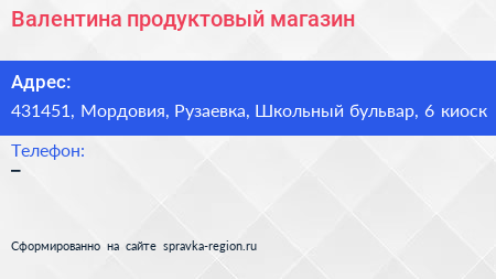 Валентина, продуктовый магазин по адресу 431451, Мордовия, Рузаевка, Школьный бульвар, 6 киоск в дальнейшем Организация, размещена в следующих категориях: