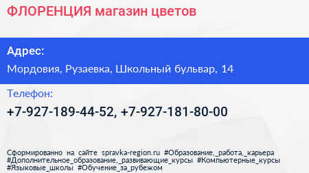 ФЛОРЕНЦИЯ, магазин цветов по адресу Мордовия, Рузаевка, Школьный бульвар, 14 в дальнейшем Организация, размещена в следующих категориях: