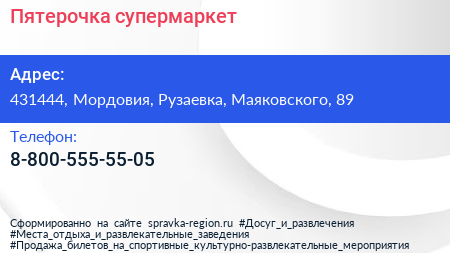 Пятерочка, супермаркет по адресу 431444, Мордовия, Рузаевка, Маяковского, 89 в дальнейшем Организация, размещена в следующих категориях: