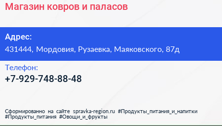 Магазин ковров и паласов по адресу 431444, Мордовия, Рузаевка, Маяковского, 87д в дальнейшем Организация, размещена в следующих категориях: