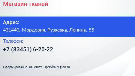 Магазин тканей по адресу 431440, Мордовия, Рузаевка, Ленина, 55 в дальнейшем Организация, размещена в следующих категориях: