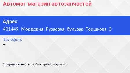 Автомаг, магазин автозапчастей по адресу 431449, Мордовия, Рузаевка, бульвар Горшкова, 3 в дальнейшем Организация, размещена в следующих категориях: