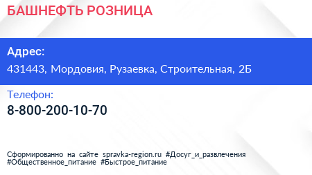 БАШНЕФТЬ-РОЗНИЦА по адресу 431443, Мордовия, Рузаевка, Строительная, 2Б в дальнейшем Организация, размещена в следующих категориях: