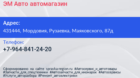 ЭМ Авто, автомагазин по адресу 431444, Мордовия, Рузаевка, Маяковского, 87д в дальнейшем Организация, размещена в следующих категориях:
