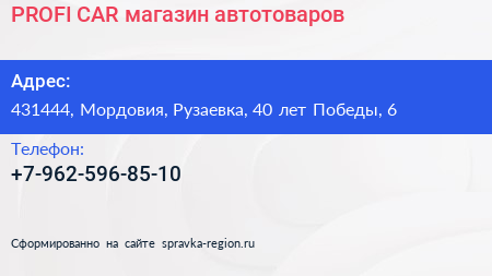 PROFI-CAR, магазин автотоваров по адресу 431444, Мордовия, Рузаевка, 40 лет Победы, 6 в дальнейшем Организация, размещена в следующих категориях: