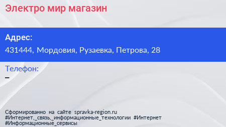 Электро-мир, магазин по адресу 431444, Мордовия, Рузаевка, Петрова, 28 в дальнейшем Организация, размещена в следующих категориях: