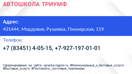 АВТОШКОЛА ТРИУМФ по адресу 431444, Мордовия, Рузаевка, Пионерская, 119 в дальнейшем Организация, размещена в следующих категориях: