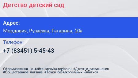 Детство, детский сад по адресу Мордовия, Рузаевка, Гагарина, 10а в дальнейшем Организация, размещена в следующих категориях: