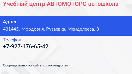 Учебный центр АВТОМОТОРС, автошкола по адресу 431445, Мордовия, Рузаевка, Менделеева, 8 в дальнейшем Организация, размещена в следующих категориях:
