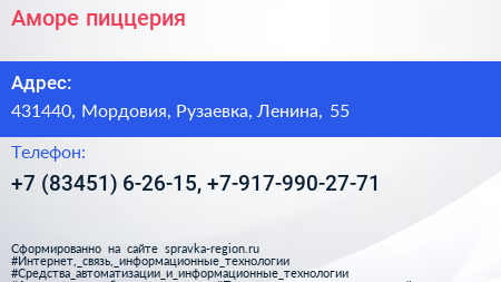 Аморе, пиццерия по адресу 431440, Мордовия, Рузаевка, Ленина, 55 в дальнейшем Организация, размещена в следующих категориях: