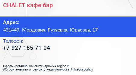 CHALET, кафе-бар по адресу 431449, Мордовия, Рузаевка, Юрасова, 17 в дальнейшем Организация, размещена в следующих категориях: