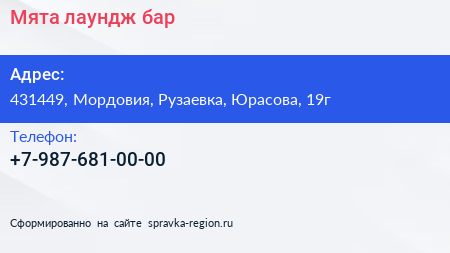 Мята, лаундж-бар по адресу 431449, Мордовия, Рузаевка, Юрасова, 19г в дальнейшем Организация, размещена в следующих категориях: