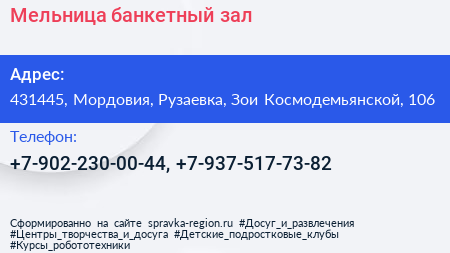 Мельница, банкетный зал по адресу 431445, Мордовия, Рузаевка, Зои Космодемьянской, 106 в дальнейшем Организация, размещена в следующих категориях: