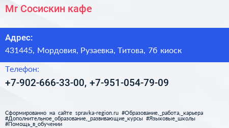 Mr.Сосискин, кафе по адресу 431445, Мордовия, Рузаевка, Титова, 7б киоск в дальнейшем Организация, размещена в следующих категориях: