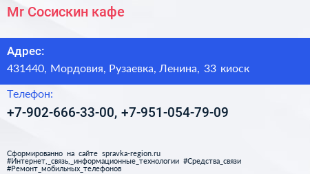 Mr.Сосискин, кафе по адресу 431440, Мордовия, Рузаевка, Ленина, 33 киоск в дальнейшем Организация, размещена в следующих категориях: