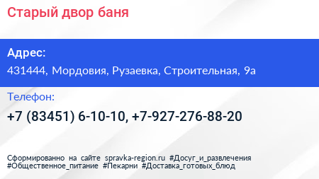 Старый двор, баня по адресу 431444, Мордовия, Рузаевка, Строительная, 9а в дальнейшем Организация, размещена в следующих категориях:
