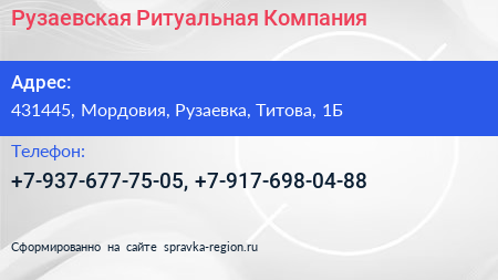 Рузаевская Ритуальная Компания по адресу 431445, Мордовия, Рузаевка, Титова, 1Б в дальнейшем Организация, размещена в следующих категориях: