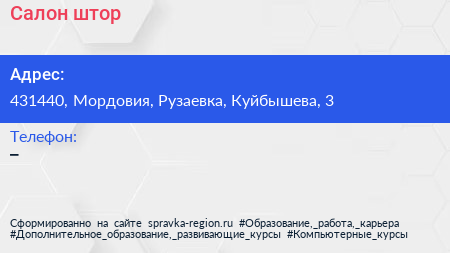 Салон штор по адресу 431440, Мордовия, Рузаевка, Куйбышева, 3 в дальнейшем Организация, размещена в следующих категориях: