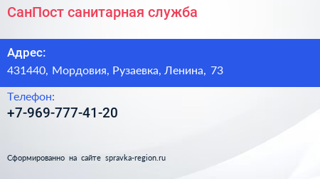 СанПост, санитарная служба по адресу 431440, Мордовия, Рузаевка, Ленина, 73 в дальнейшем Организация, размещена в следующих категориях: