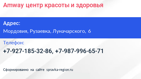 Amway, центр красоты и здоровья по адресу Мордовия, Рузаевка, Луначарского, 6 в дальнейшем Организация, размещена в следующих категориях:
