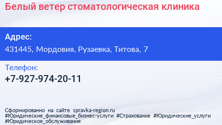 Белый ветер, стоматологическая клиника по адресу 431445, Мордовия, Рузаевка, Титова, 7 в дальнейшем Организация, размещена в следующих категориях:
