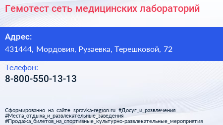 Гемотест, сеть медицинских лабораторий по адресу 431444, Мордовия, Рузаевка, Терешковой, 72 в дальнейшем Организация, размещена в следующих категориях: