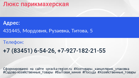 Люкс, парикмахерская по адресу 431445, Мордовия, Рузаевка, Титова, 5 в дальнейшем Организация, размещена в следующих категориях: