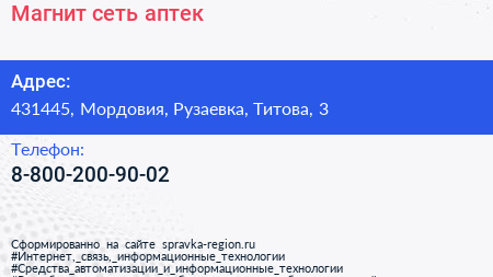 Магнит, сеть аптек по адресу 431445, Мордовия, Рузаевка, Титова, 3 в дальнейшем Организация, размещена в следующих категориях: