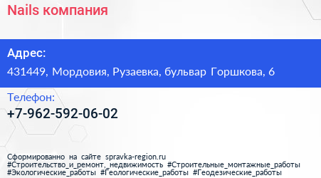 Nails, компания по адресу 431449, Мордовия, Рузаевка, бульвар Горшкова, 6 в дальнейшем Организация, размещена в следующих категориях:
