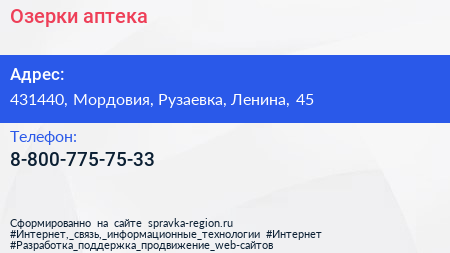 Озерки, аптека по адресу 431440, Мордовия, Рузаевка, Ленина, 45 в дальнейшем Организация, размещена в следующих категориях: